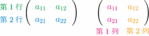 $(i,j)$ 成分という.特に,行番号と列番号が一致する成分 $a_{11}$ と $a_{22}$ は