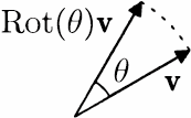 この行列を $\mathrm{Rot}(\theta)$ と表すことにしよう.すなわち,任意に与えられたベクトル $\mathbf{v}$ に対して,$\mathrm{Rot}(\theta)\mathbf{v}$ は $\mathbf{v}$ と $\theta$ の角をなし.大きさ(長さ)は $\mathbf{v}$ と等しいベクトルである