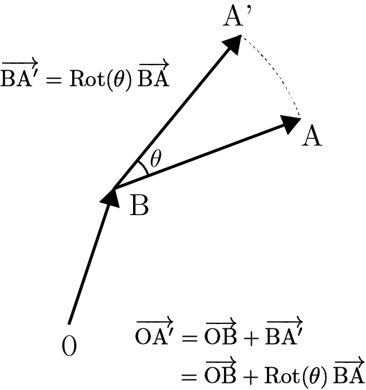=\overrightarrow{\mathrm{OB}}+\mathrm{Rot}(\theta)\,\overrightarrow{\mathrm{BA}}$