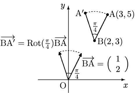 点 $\mathrm{A}(3,5)$ を点 $\mathrm{B}(2,3)$ を中心に角 $\dfrac{\pi}{4}$ 回転させた点を $\mathrm{A'}$ とすると,