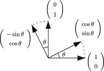 により $\left\{\,\left(\begin{array}{c}\cos\theta\\\sin\theta\end{array}\right),\left(\begin{array}{c}-\sin\theta\\\cos\theta\end{array}\right)\,\right\}$ に移される.この様子を図で観察すると,この変換が確かに角 $\theta$ の回転を表していることがわかるであろう.