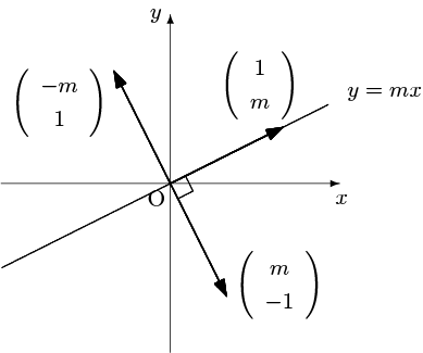 よりベクトル $\left(\begin{array}{c}1\\m\end{array}\right)$ を動かさず,それと垂直なベクトル $\left(\begin{array}{c}m\\-1\end{array}\right)$ を反転させる.このことはこの変換が直線 $y=mx$ に関する対称移動を表すことを意味する.