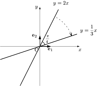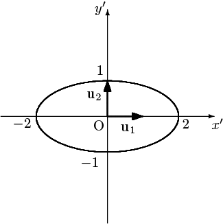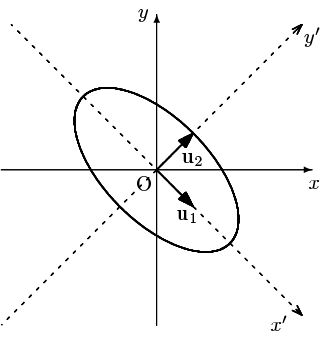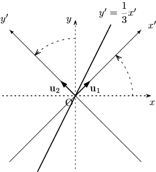 により $\{\mathbf{u}_1,\mathbf{u}_2\}=\left\{\,\dfrac{1}{\sqrt{2}}\left(\begin{array}{c}1\\-1\end{array}\right),\dfrac{1}{\sqrt{2}}\left(\begin{array}{c}1\\1\end{array}\right)\,\right\}$ に変換されたと見ることができ